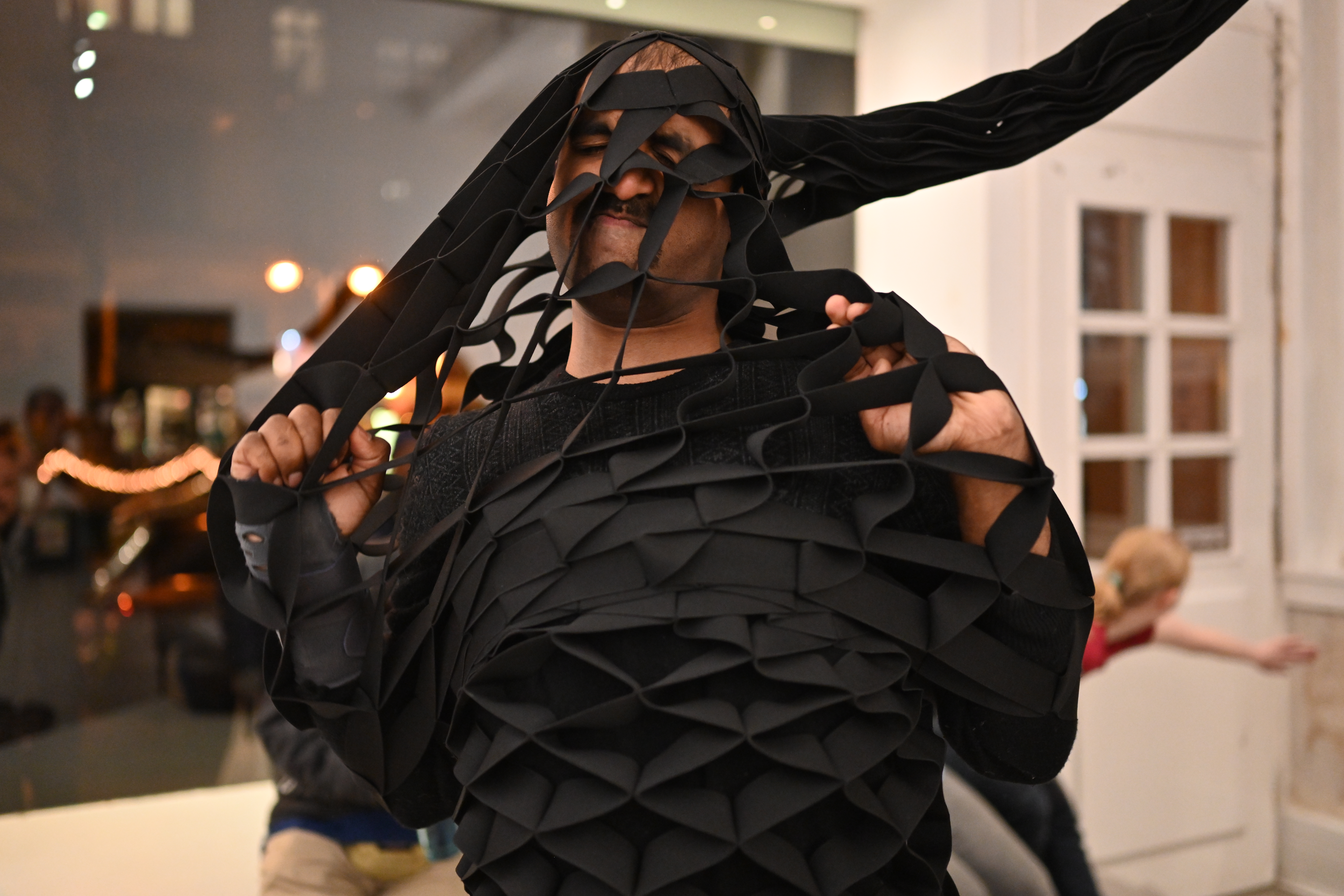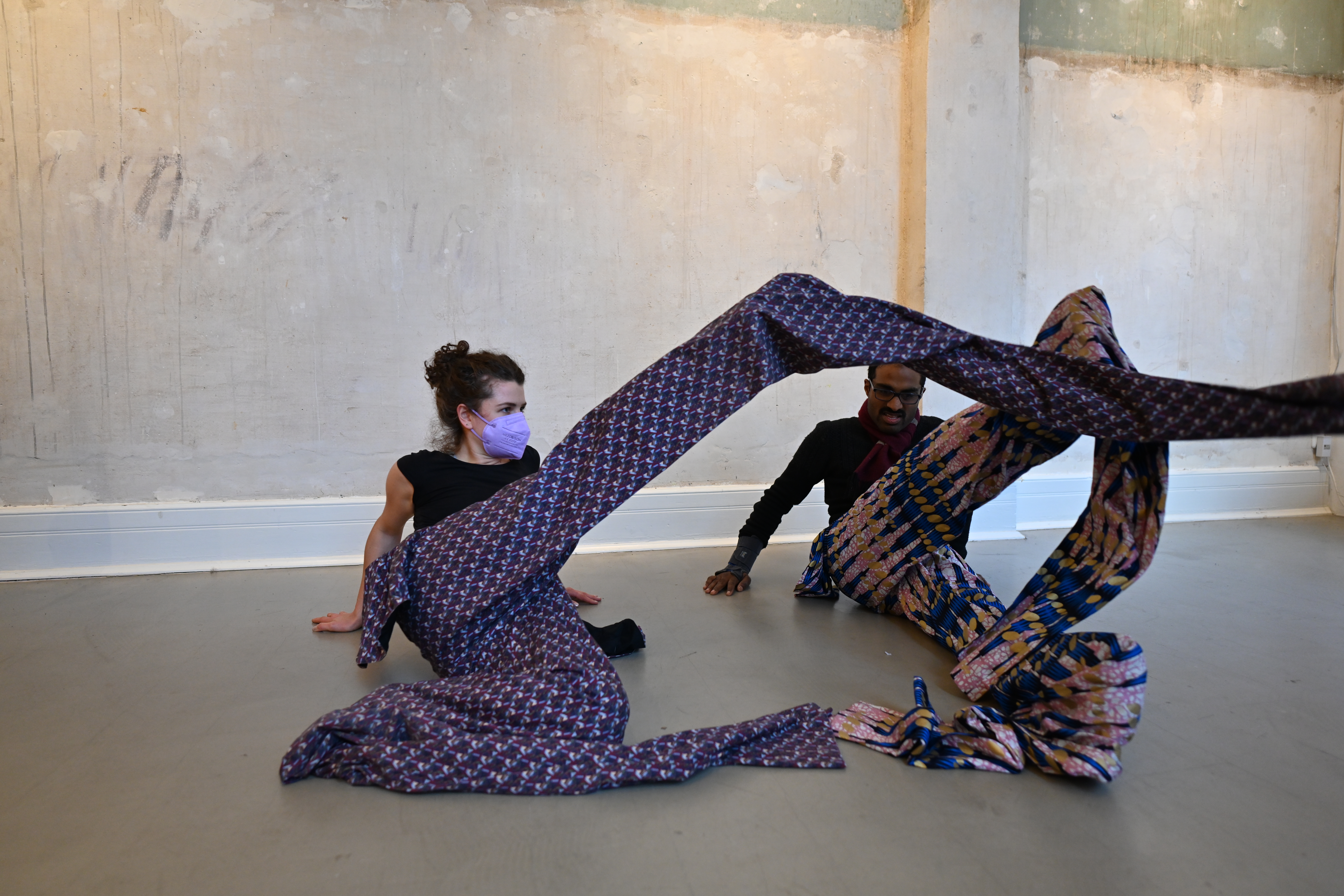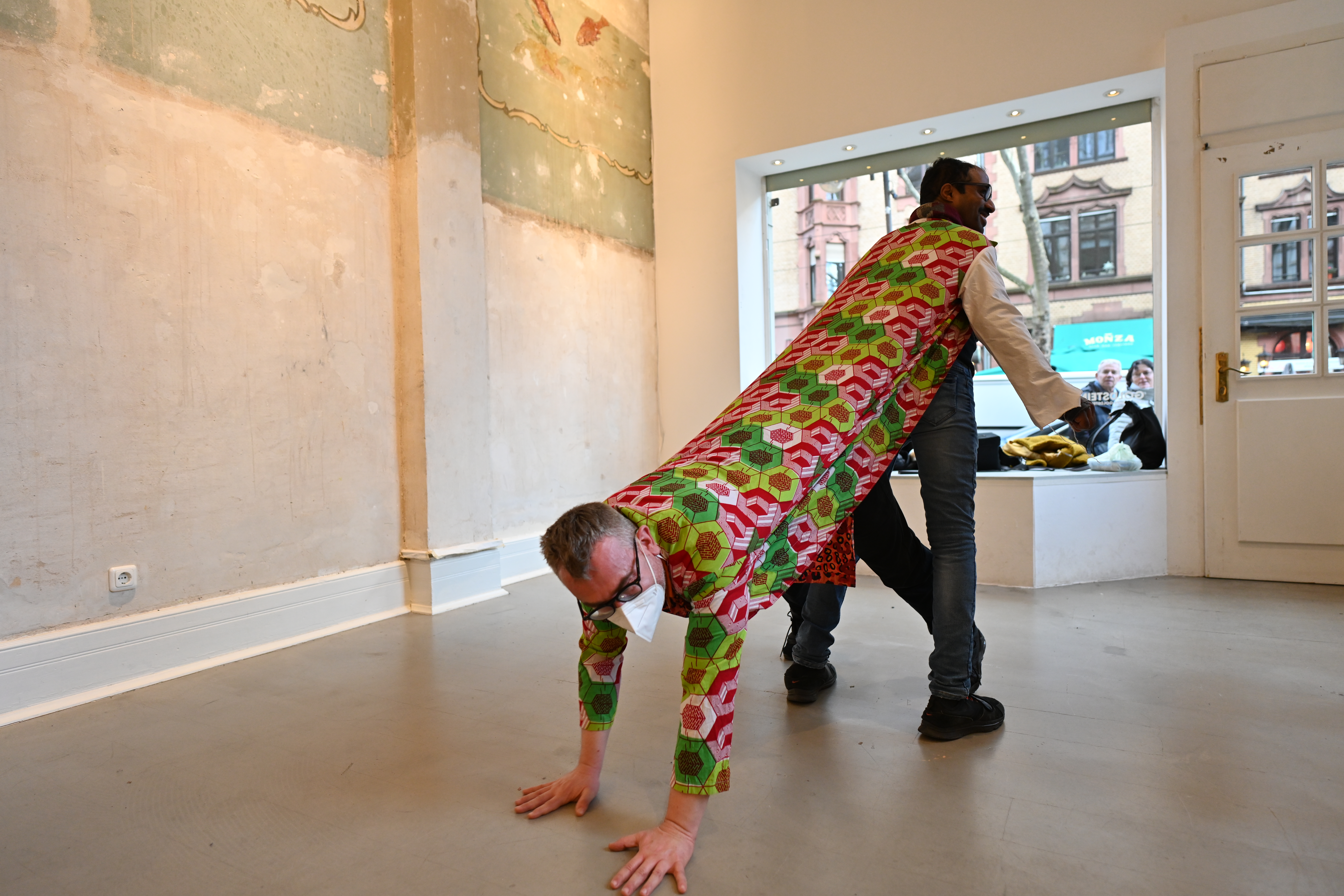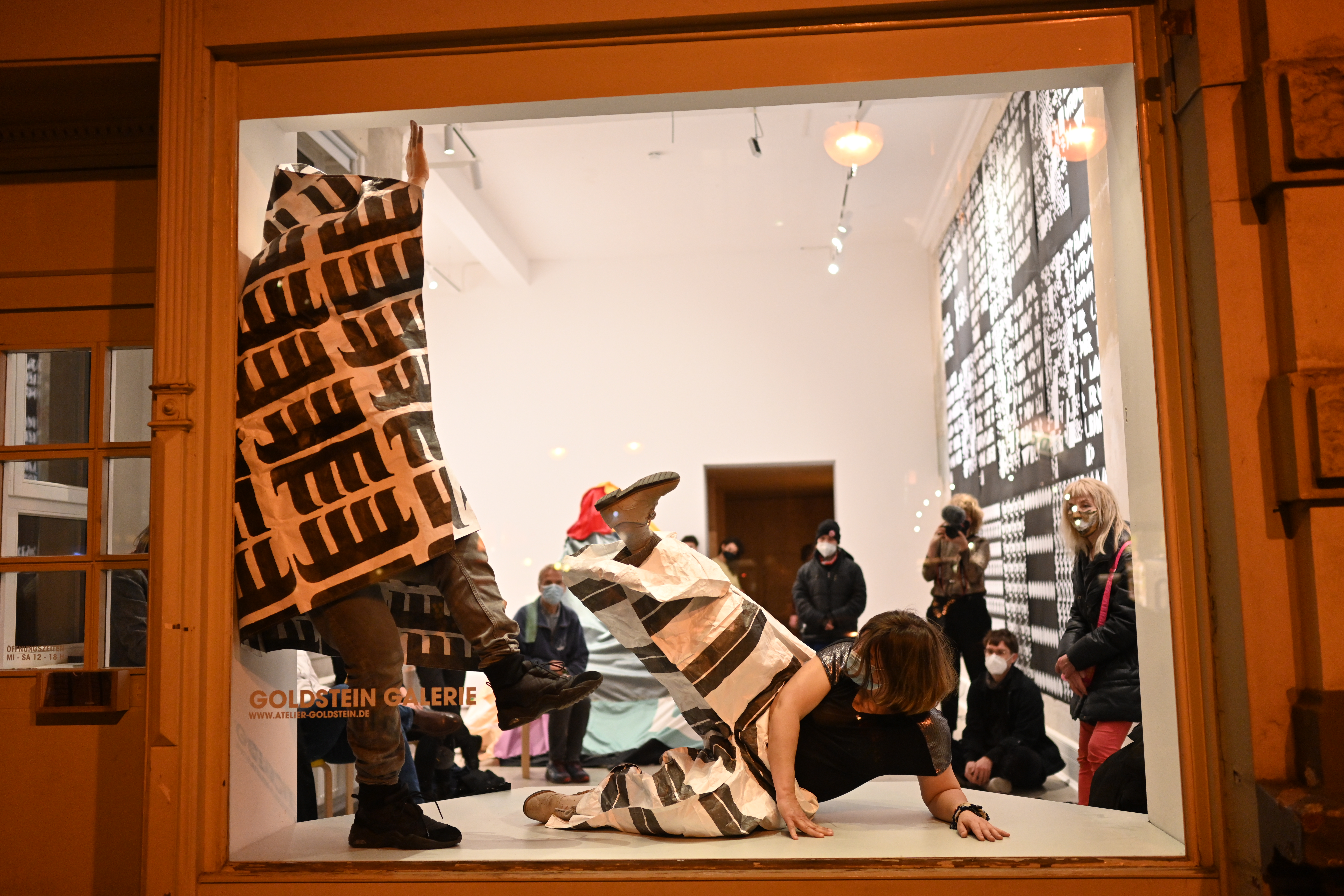 Die Säule geht an der Last vorbei gehörte zu der Veranstaltungsreihe Über das Fliehen des Atelier Goldstein. Sie widmet sich den bildhaften und gedanklichen Aspekten von Flucht als kreative Strategie und künstlerische Taktik. In Zusammenarbeit mit der Theatergruppe Gintersdorfer/Klaßen und den bildenden Künstler*innen des Atelier Goldstein entstand eine Performance und eine Ausstellung, die anschließend in der Goldstein Galerie gezeigt wurde.
